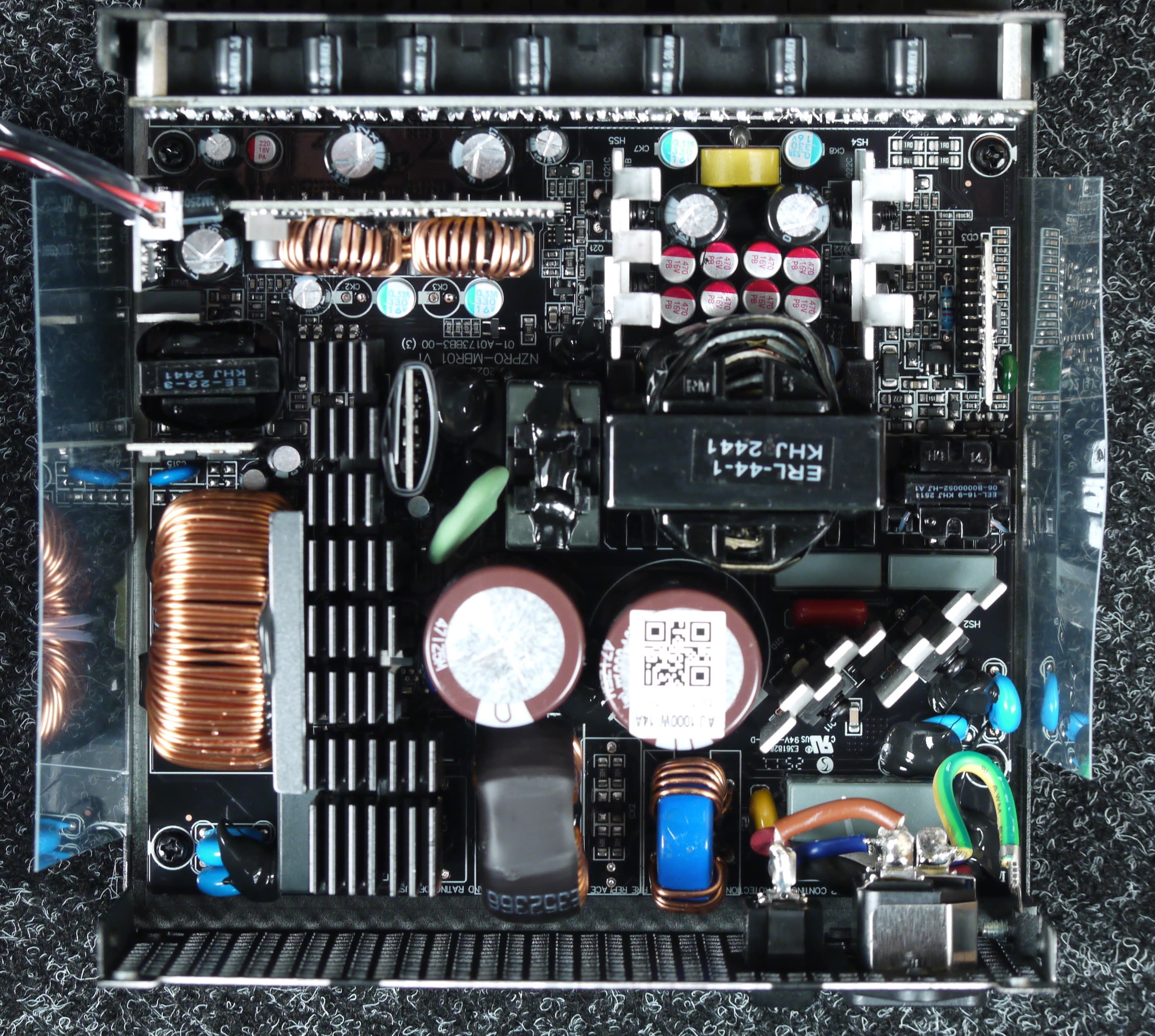 Конструкция блока питания вполне соответствует современным тенденциям: активный корректор коэффициента мощности, синхронный выпрямитель для канала +12VDC, независимые импульсные преобразователи постоянного тока для линий +3.3VDC и +5VDC.