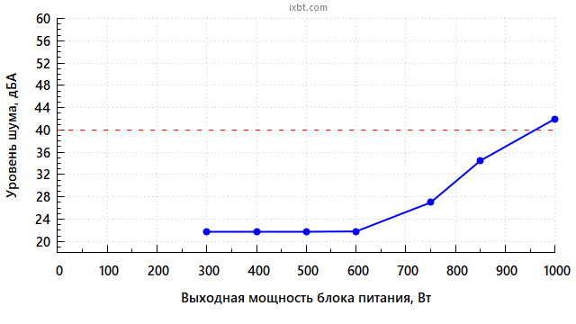 В диапазоне мощности до 600 Вт включительно шум блока питания находится на минимально заметном уровне для жилого помещения в дневное время суток (23 дБА и менее), его работу можно считать условно бесшумной