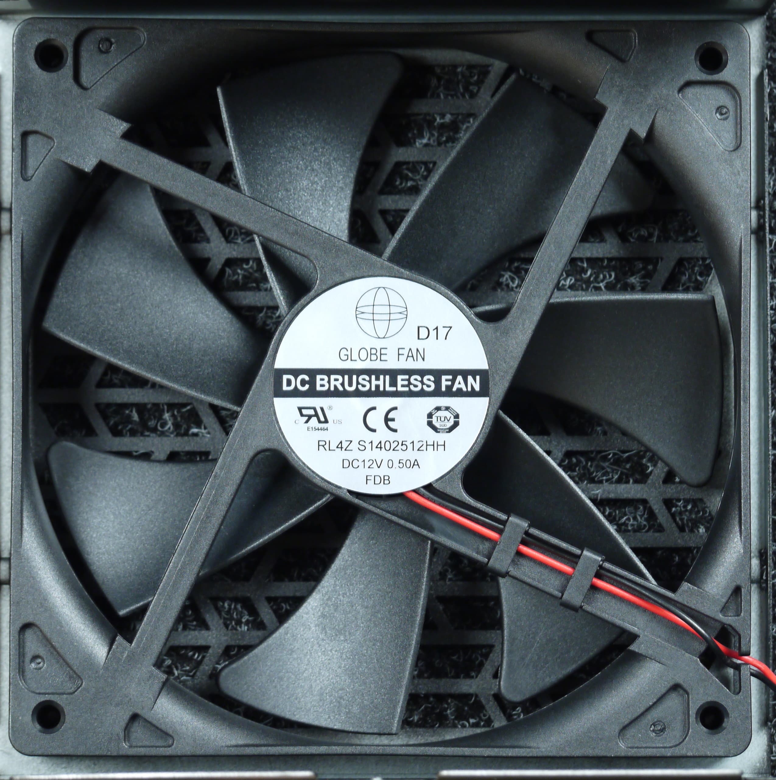 В блоке питания установлен вентилятор Globe Fan RL4Z S1402512HH типоразмера 140 мм, подключение двухпроводное, через разъем.