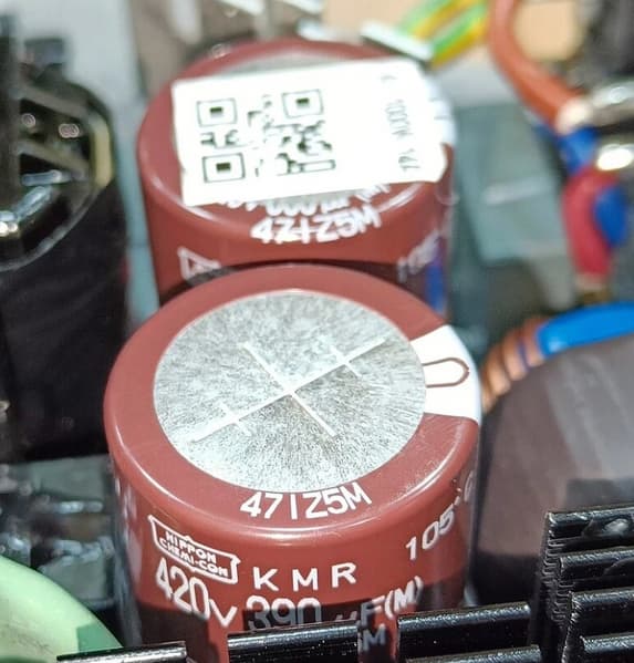 Высоковольтные конденсаторы представлены батареей из двух элементов производства Nippon Chemi-Con серии KMR по 390 мкФ (420 В) каждый.