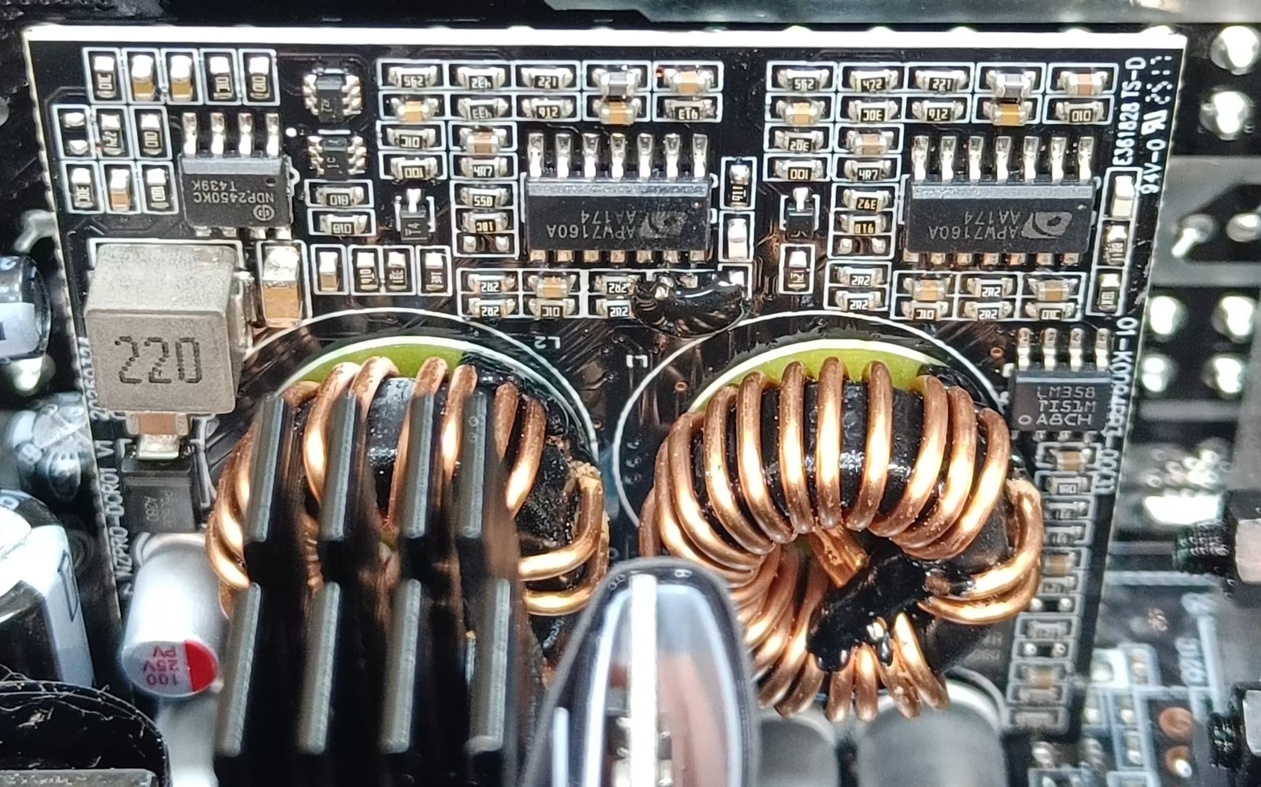 Транзисторы синхронного выпрямителя установлены с лицевой стороны основной печатной платы, на них имеется радиатор, что в случае блока питания, предполагающего пассивное охлаждение в некоторых режимах работы, можно только приветствовать. Собран он на шести транзисторах HYG020N04.