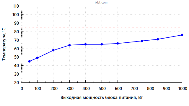 Также стоит учитывать, что в случае работы с остановленным вентилятором температура компонентов внутри БП сильно зависит от окружающей температуры воздуха, и если та установится на уровне 40-45 °C, это приведет к более раннему включению вентилятора.