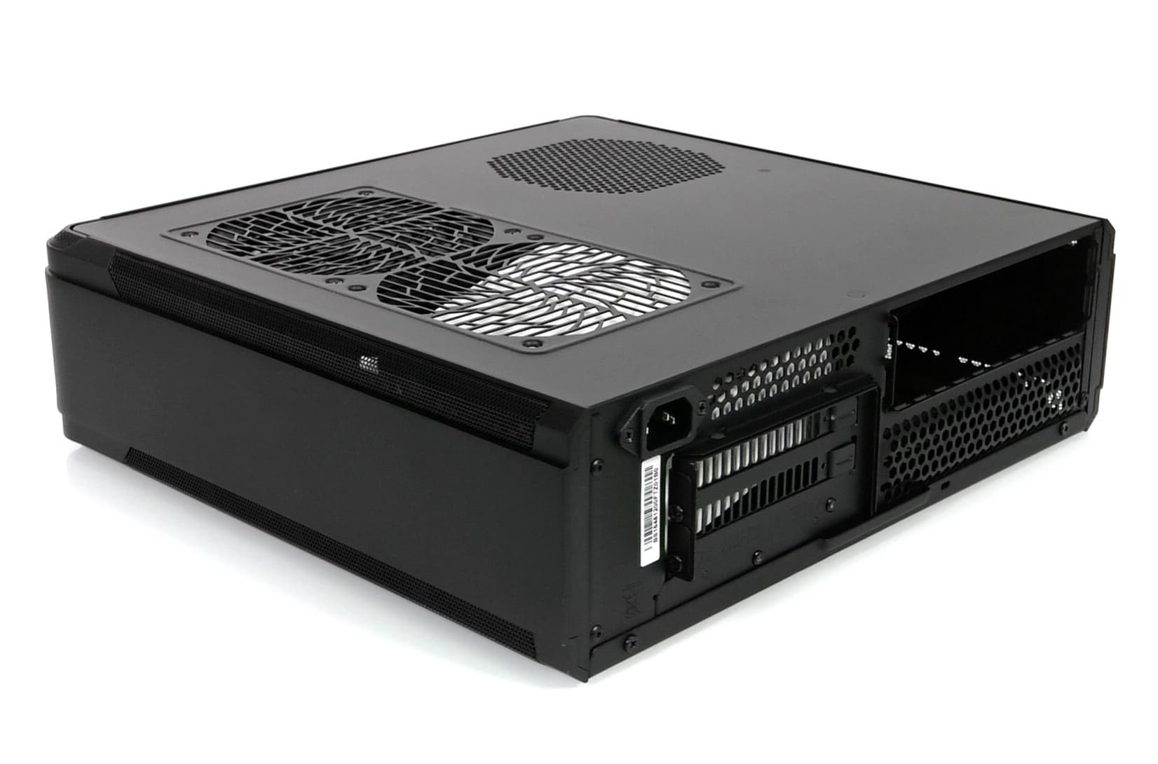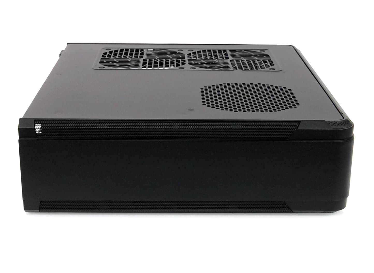 Бо́льшая часть торцов алюминиевого шасси выполнена в виде областей со стальной сеткой для лучшего проветривания комплектующих. Смотрится такое решение аккуратно, внешний вид корпуса не портит. На боковых стенках (опять же, если рассматривать горизонтальное расположение) ничего нет, только прочный алюминий. На верхней стенке находится одно вентиляционное отверстие под корпусной вентилятор, а на нижней — целых три: два под корпусные вентиляторы и еще одно под вентилятор блока питания.