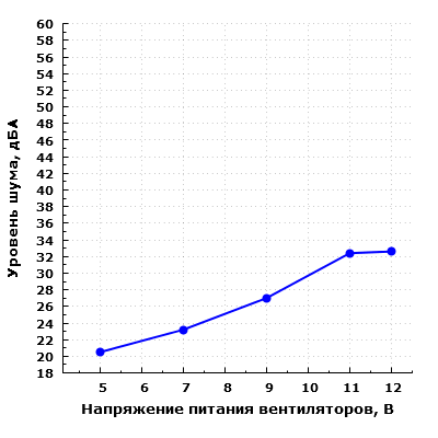 Уровень шума системы охлаждения изменяется от 20,5 до 32,6 дБА при расположении микрофона в ближнем поле. При питании вентиляторов напряжением 5 В шум находится на минимально заметном уровне даже при расположении микрофона в ближнем поле. Однако с ростом напряжения питания уровень шума возрастает. В типовом диапазоне регулирования напряжения 7—11 В шум изменяется от низкого (23,2 дБА) до среднего (32,4 дБА) уровня относительно типичных значений для жилых помещений в дневное время суток. Впрочем, даже при питании вентиляторов номинальным напряжением 12 В уровень шума системы охлаждения весьма далек от пороговых 40 дБА и находится в комфортном диапазоне для большинства пользователей.