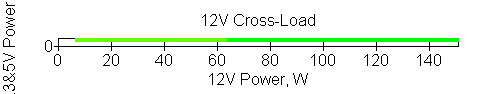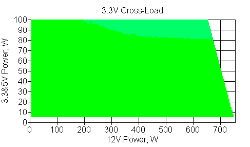 Следующим этапом инструментального тестирования является построение кросснагрузочной характеристики (КНХ) и представление ее на четвертьплоскости, ограниченной максимальной мощностью по шине 3,3&5 В с одной стороны (по оси ординат) и максимальной мощностью по шине 12 В с другой (по оси абсцисс). В каждой точке измеренное значение напряжения обозначается цветовым маркером в зависимости от отклонения от номинального значения.