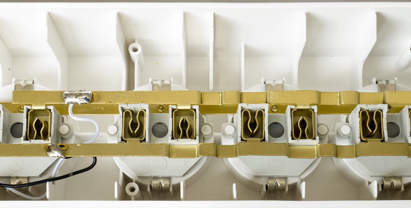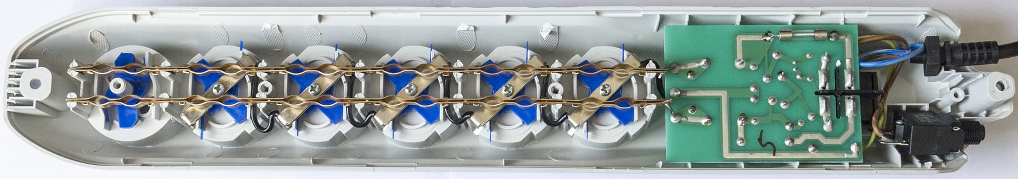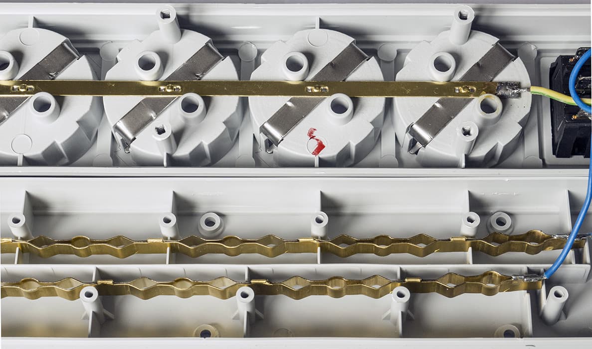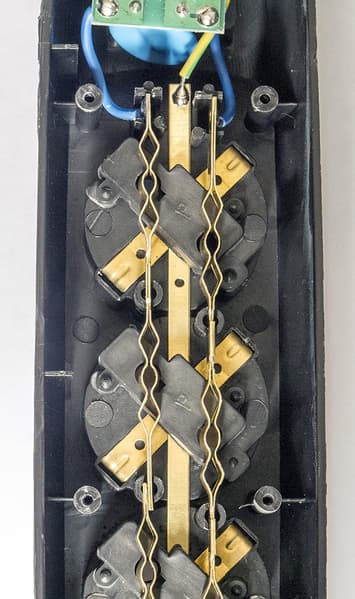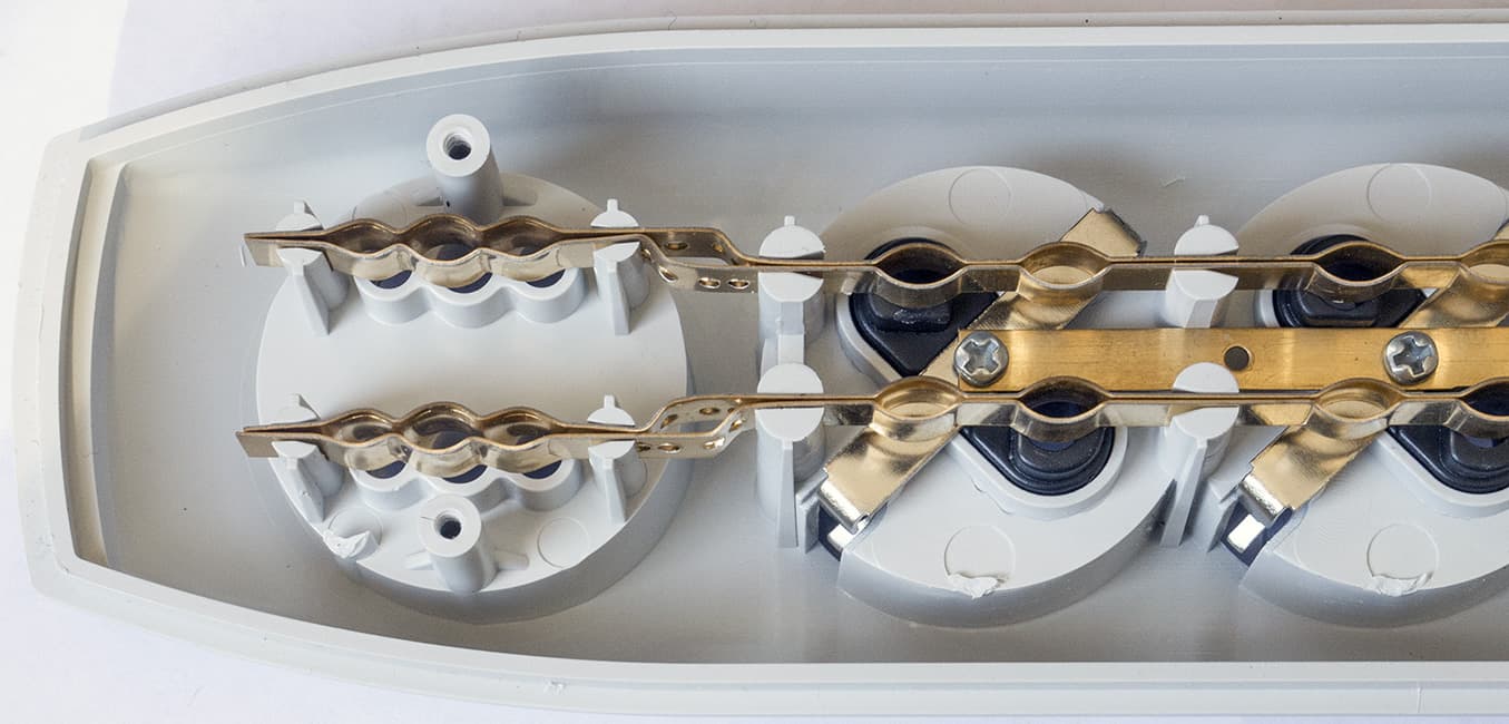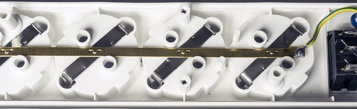 | Токопроводящие шины | Сдвоенные полосы из желтого металла 6,5×0,5 мм. Соединения: силовые шины и провода — пайкой, контакты PE розеток — заклепками. |