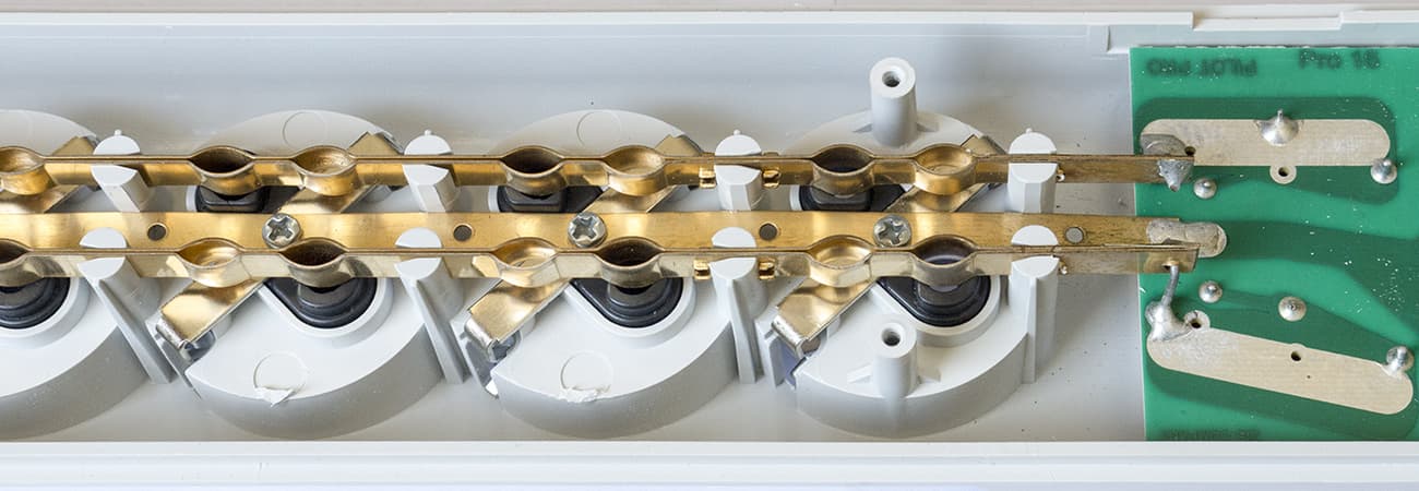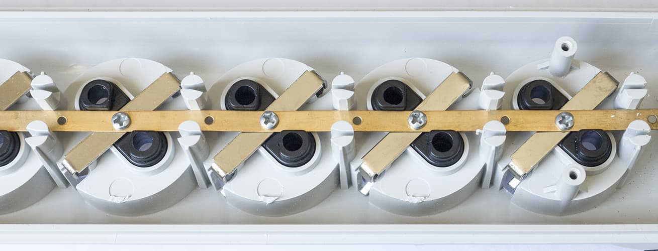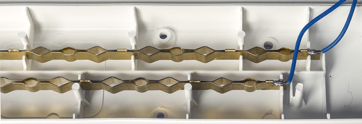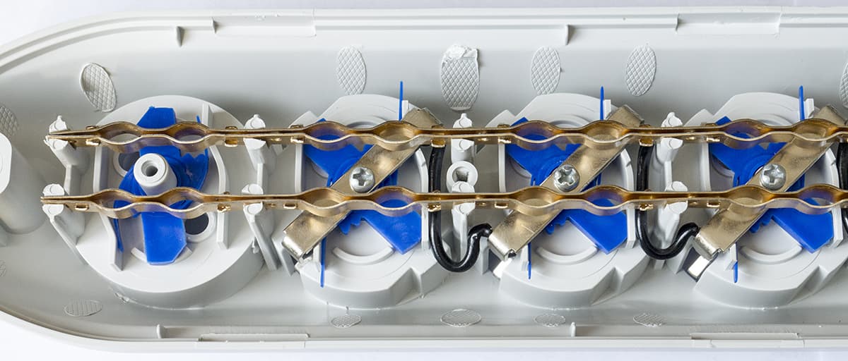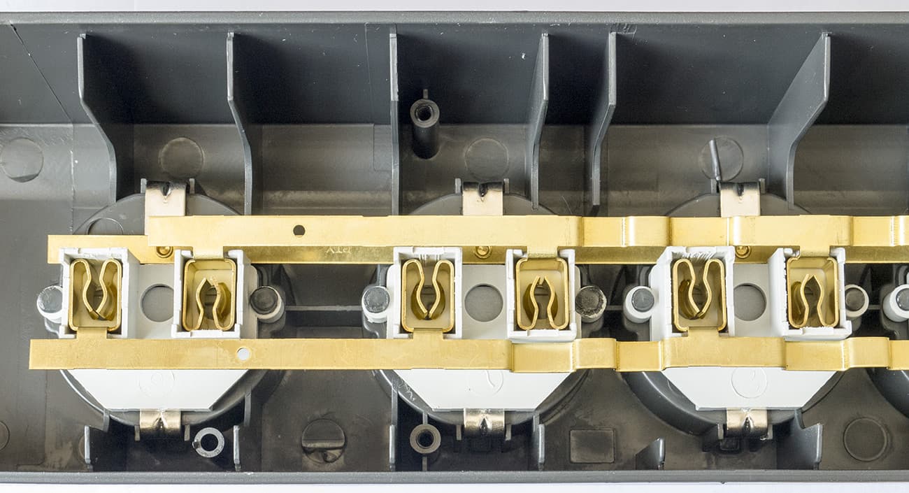 | Токопроводящие шины | Сдвоенные полосы из желтого металла 6,5×0,5 мм. Соединения: силовые шины и провода — пайкой, контакты PE розеток — заклепками. |