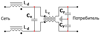 Элементы Ld (дроссели на незамкнутых сердечниках) и Cx подавляют дифференциальные помехи, а Lс (две обмотки на общем замкнутом сердечнике) и Cy — синфазные помехи (при наличии заземления). В идеале должны использоваться конденсаторы специализированных классов X и Y.