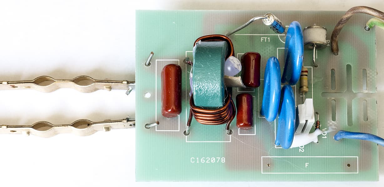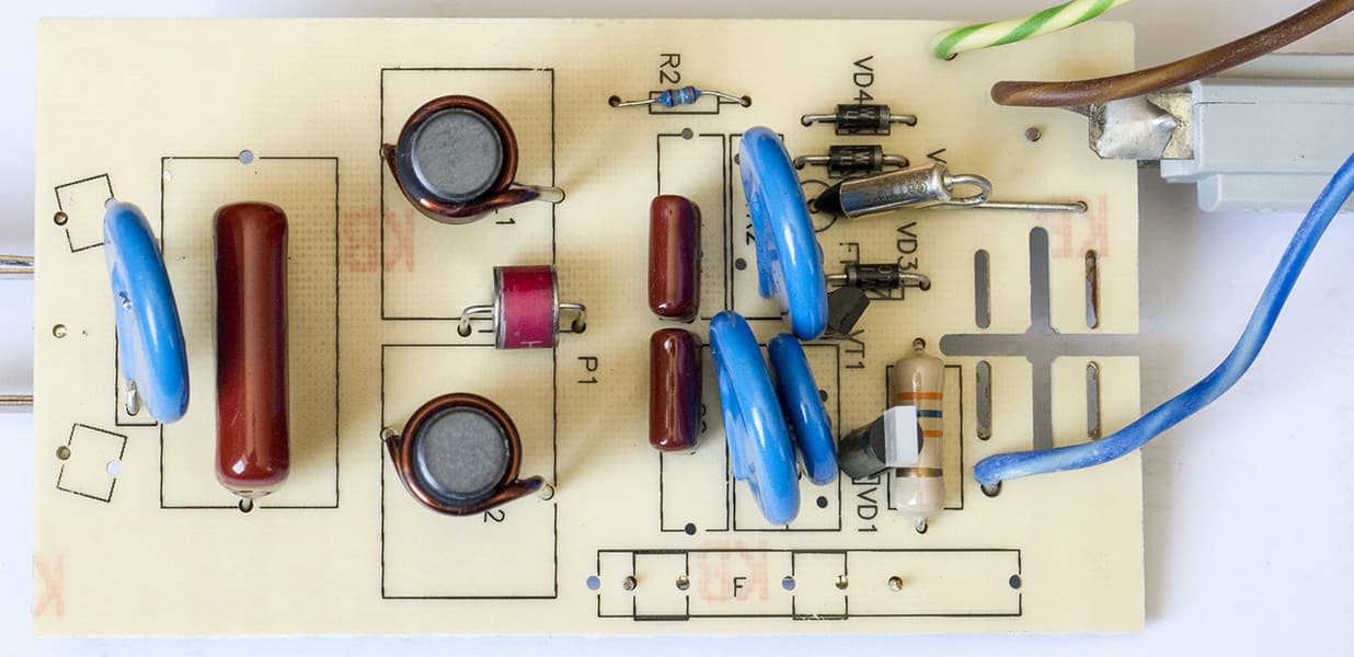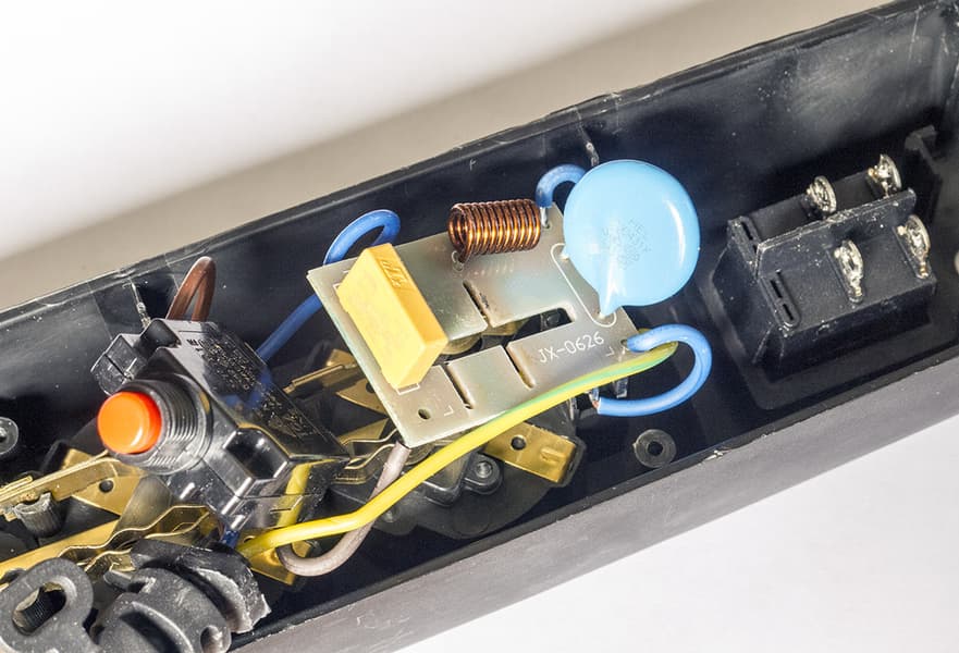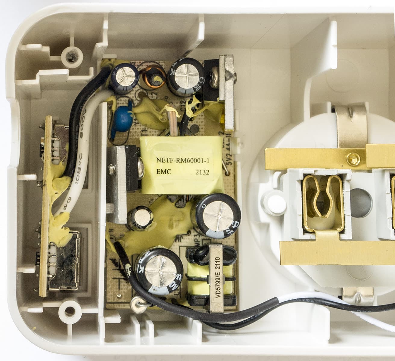 | Защита | Содержит один варистор 20D431K, защитной оболочки нет. Элементы фильтрации ВЧ-помех — конденсатор Х2 на 0,1 мкФ и дроссель без сердечника. |