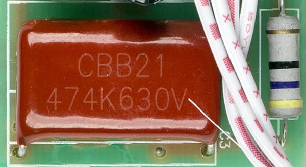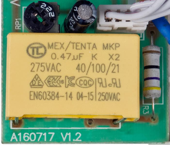 А в новом варианте конденсатор выбран с большим запасом по напряжению — на 630 В, но уже без «Х2». Надо заметить, что номинальное напряжение конденсатора — это максимально допустимое значение для постоянного тока, а для синуса в сети переменного тока его нужно, как минимум, разделить на квадратный корень из 2, то есть в данном случае получится примерно 445 В, чего вполне достаточно, даже если напряжение в сети повысится до 380-400 В (поданы две фазы вместо фазы и нейтрали).