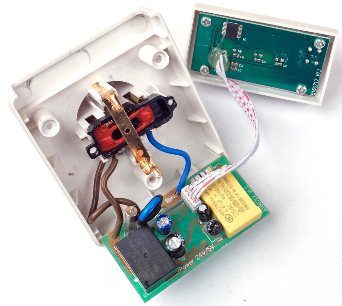 Итак: удаляем по три самореза, чтобы разъединить половинки корпуса, и видим две соединенные шлейфом платы с электронными компонентами и вилку с розеткой.