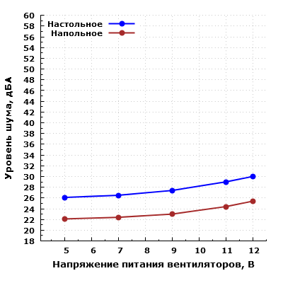 При большем удалении корпуса от пользователя и размещении его, к примеру, на полу под столом шум можно будет охарактеризовать как минимально заметный при питании вентиляторов от 5 В, а при питании от 12 В — как пониженный для жилого помещения в дневное время суток.