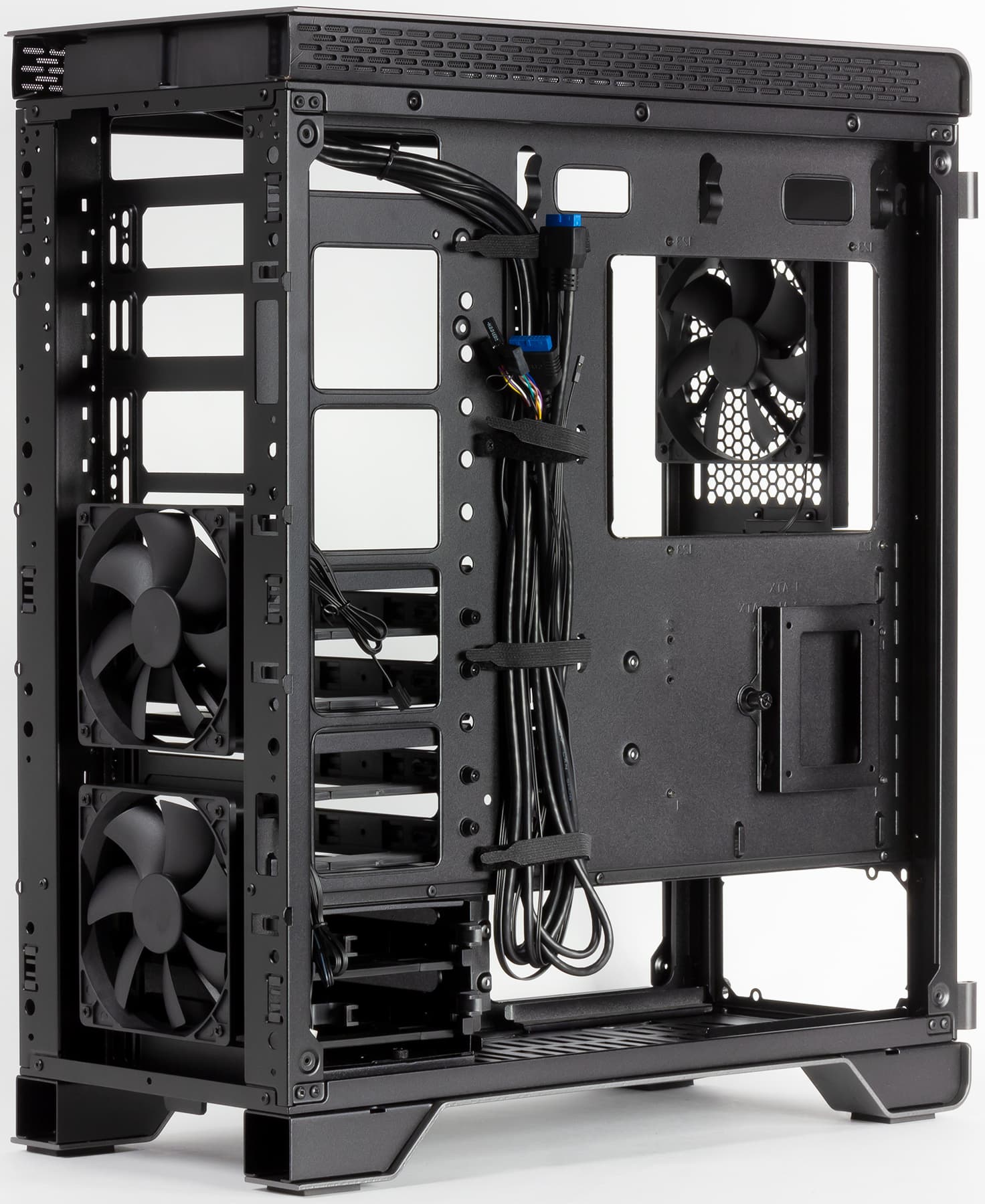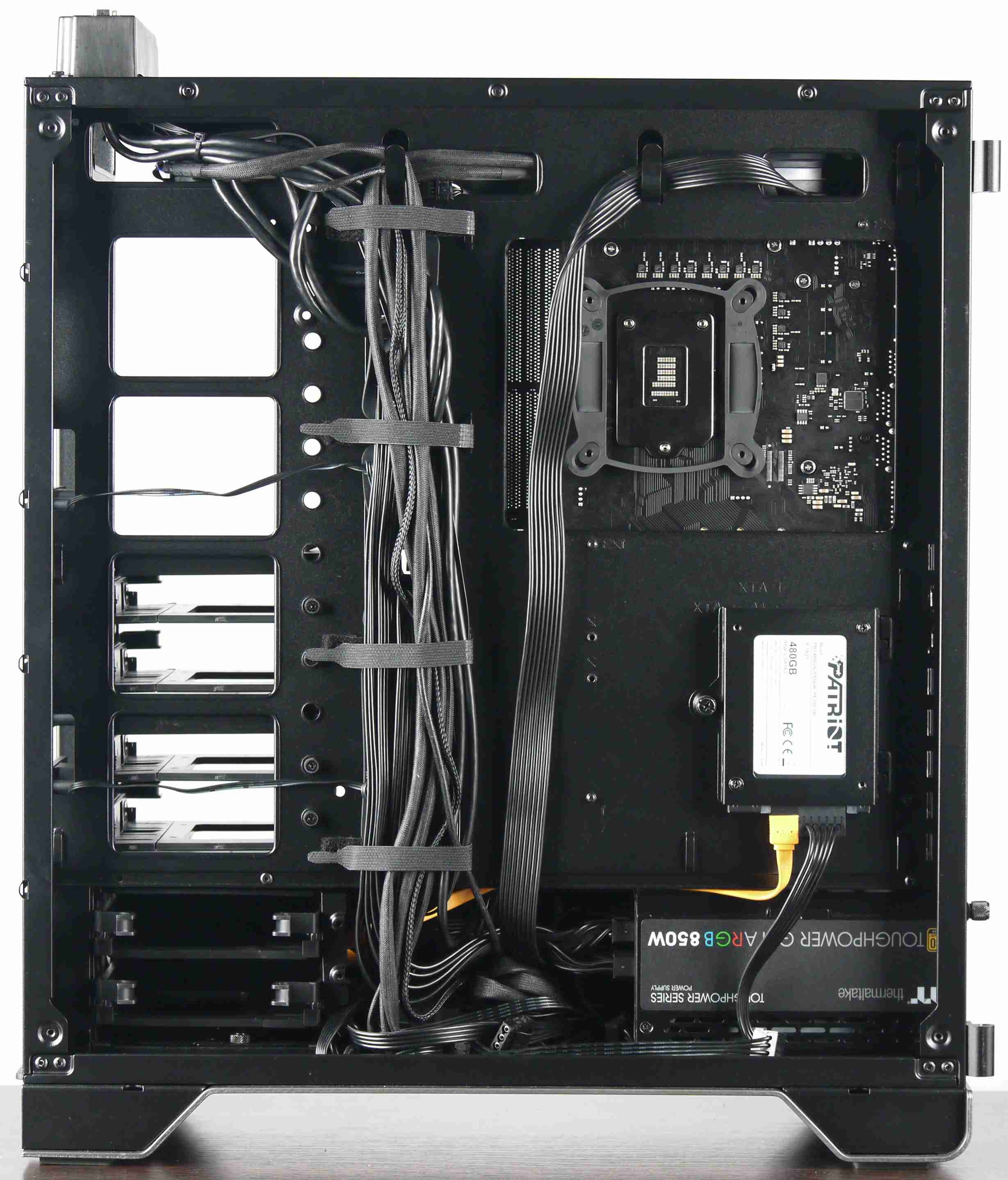 Для монтажа проводов предусмотрены петли для крепления стяжек или других аналогичных изделий. В монтажных отверстиях установлены лепестковые мембраны. Также в корпусе предустановлено несколько многоразовых нейлоновых стяжек с застежками-липучками, что облегчает сборку системного блока.