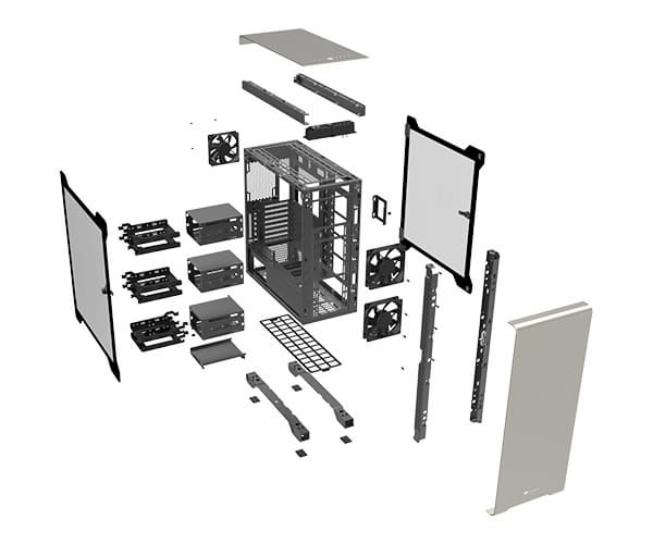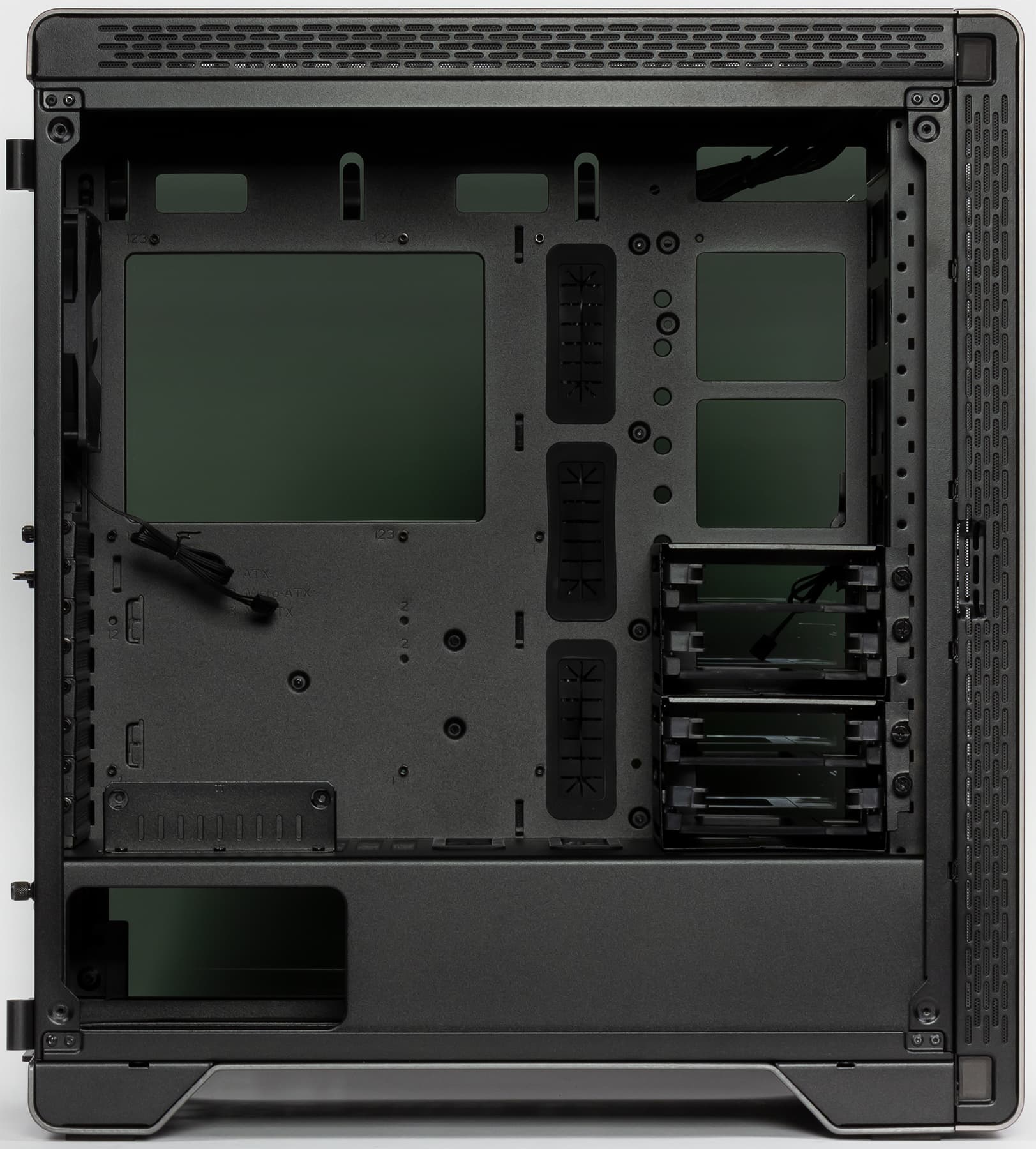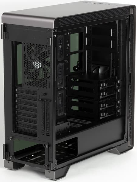 Компоновочные решения данной модели определяются современными тенденциями корпусостроения. В данном случае разработчики отказались от отсека для устройств формата 5,25″, а привычный отсек для устройств 3,5″ расположен около передней стенки шасси, он состоит из двух частей: одна установлена под кожухом, а вторая — над ним. Верхний отсек разборный и съемный: можно демонтировать его целиком или одну из его половин.