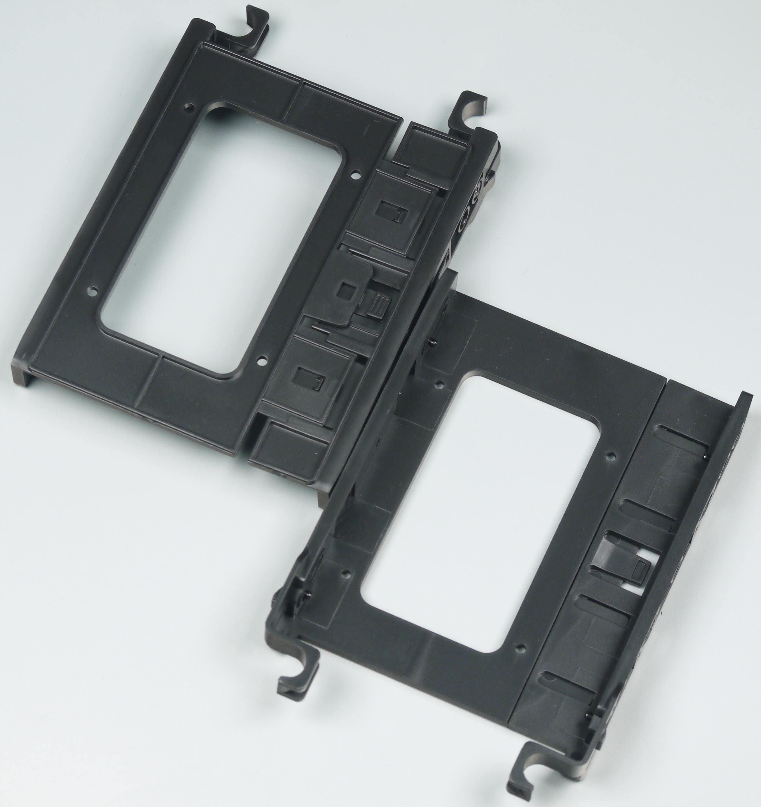 Полноразмерные жесткие диски устанавливаются в предназначенные для них отсеки через пластиковые рамки. Диск крепится к ним с помощью четырех штырей. Фиксируются рамки простым защелкиванием, надежность крепления достаточно высокая. Отметим, что данные рамки являются универсальными, их можно использовать для установки 2,5″ накопителей с креплением дисков через дно. В данном случае рамки используются раздвижные, с защелкой с внешней стороны.