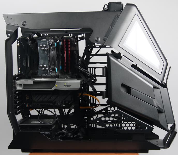 Данная модель позиционируется как решение open frame, что изначально подразумевает отсутствие внешних декоративных панелей, но тут эти панели все-таки есть, хотя большую их часть можно не устанавливать, на функционирование корпуса это никак не повлияет. А внешние панели выполняют по большей части именно декоративные функции, так как с учетом имеющихся отверстий никакого существенного влияния на охлаждение и шумоизоляцию их наличие не оказывает.
