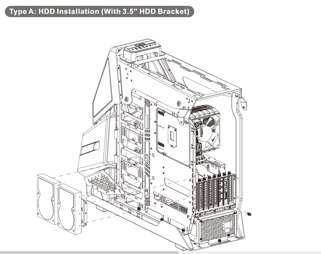 Установить блок питания тут можно только вентилятором вверх, так как днище под местом установки БП сплошное. В этом есть свои плюсы: не потребуется пылевой фильтр. К тому же, если БП оснащен подсветкой, то она будет подсвечивать внутренний объем корпуса. Длина проводов БП потребуется довольно значительная, лучше сразу брать модели с длиной проводов до разъема питания процессора от 65 сантиметров. Имеет смысл взять блок питания с модульными проводами, так как, в отличие от подавляющего большинства современных корпусов, тут блок питания остается вполне доступен и после его установки на посадочное место, добавлять/убирать провода будет удобно.