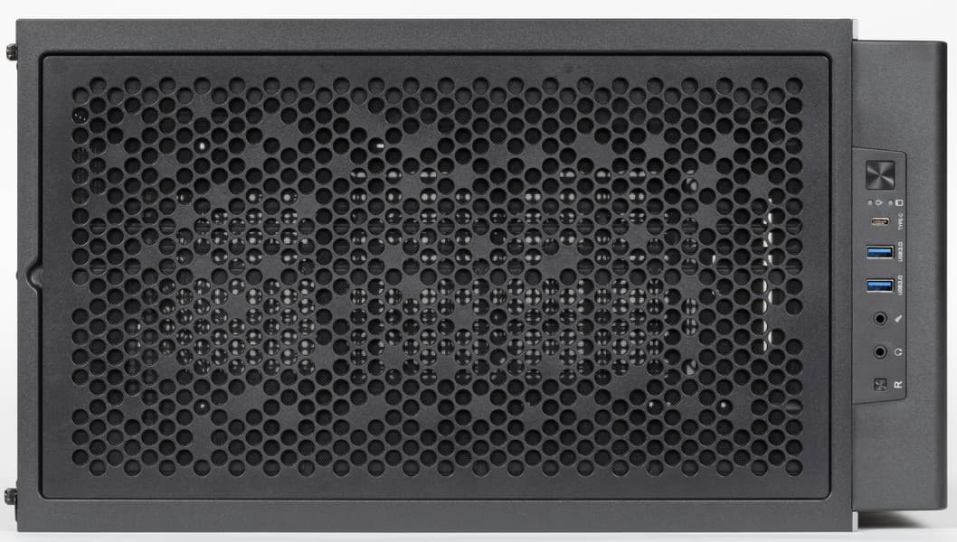Левая боковая панель (она занимает примерно три четверти соответствующей плоскости корпуса) сделана цельностеклянной, с узкой черной непрозрачной рамкой на краях и тонировкой на остальной площади, что позволит использовать комплектующие с подсветкой. Разноцветные огни будут хорошо видны и через лицевую панель, которая почти целиком состоит из металлической сетки с крупными круглыми отверстиями.