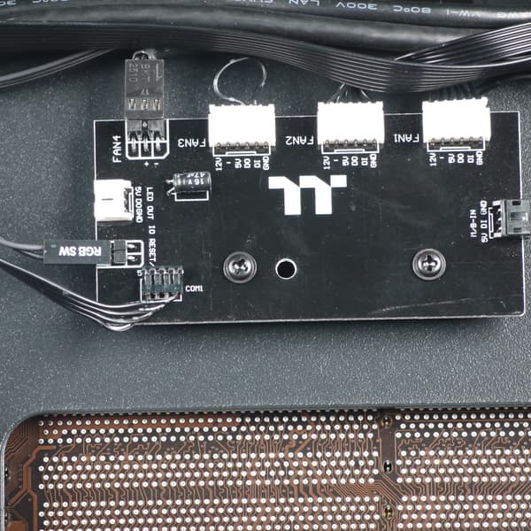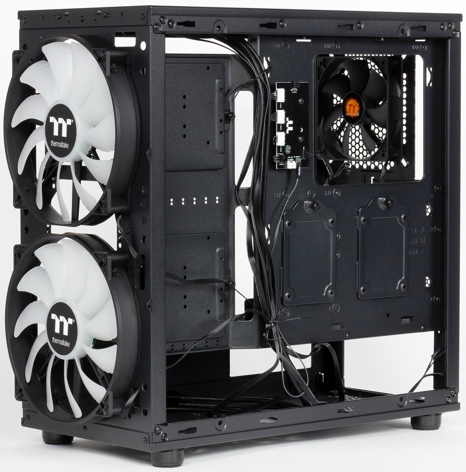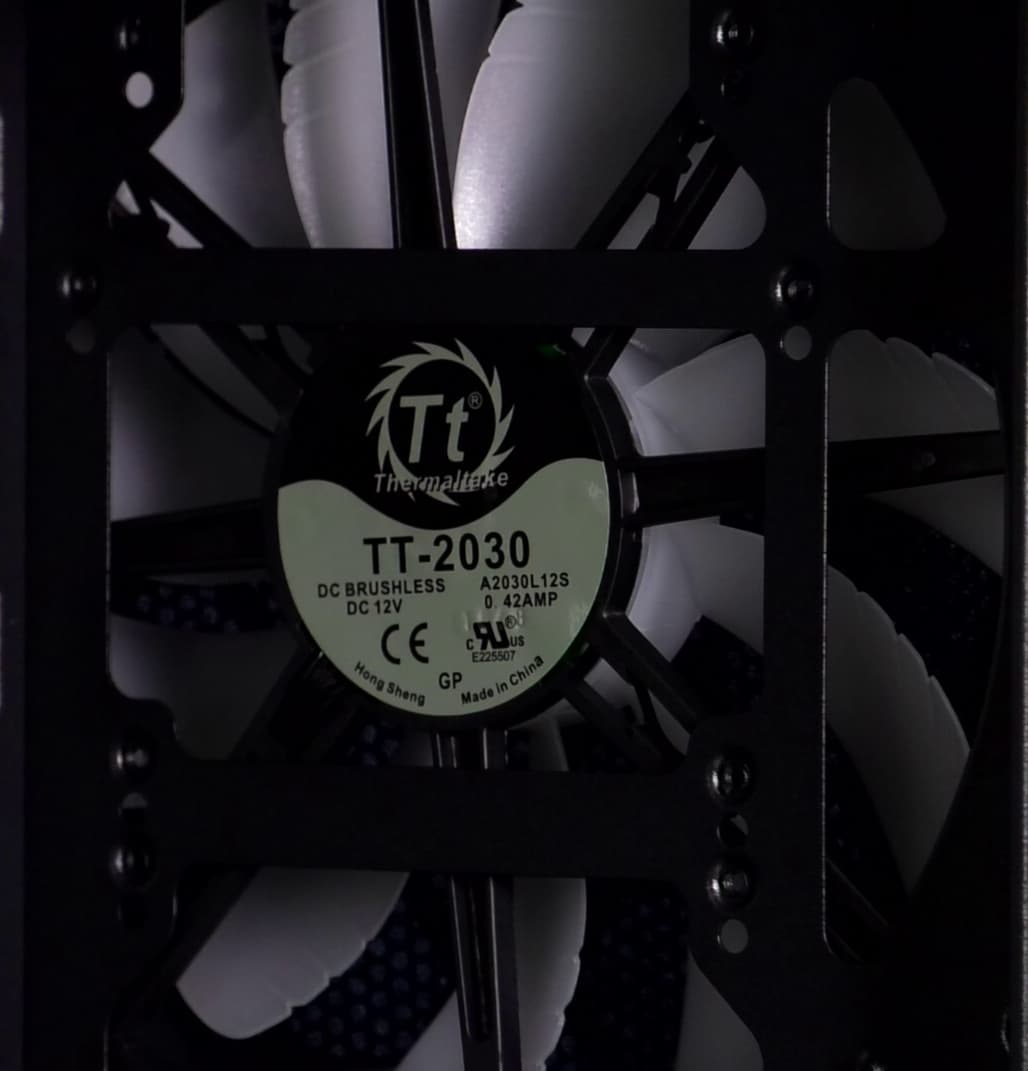 В корпусе предустановлены три вентилятора: один типоразмера 120 мм сзади и два типоразмера 200 мм с индивидуально адресуемой RGB-подсветкой спереди. Передние вентиляторы имеют шестиконтактные разъемы с колодкой 1×6, задний — стандартный трехконтактный.