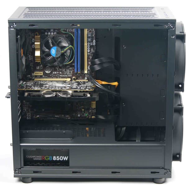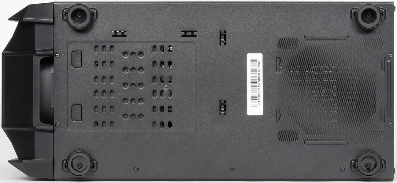 Кожух блока питания в данном случае не только пропускает воздух со стороны передней панели, но и имеет вентиляционную решетку, что не позволяет надеяться на изолирующие свойства этого конструкционного элемента от нагретого воздуха в общем объеме и от «выхлопа» видеокарты. Судя по его конструкции, кожух для этого и не предназначен, в основном он исполняет роль своеобразного элемента жесткости, который обеспечивает дополнительную фиксацию основания для системной платы с нижней стороны. Также кожух создает место для скрытой установки блока питания с выводом проводов сразу за основание для системной платы, что выглядит более эстетично.