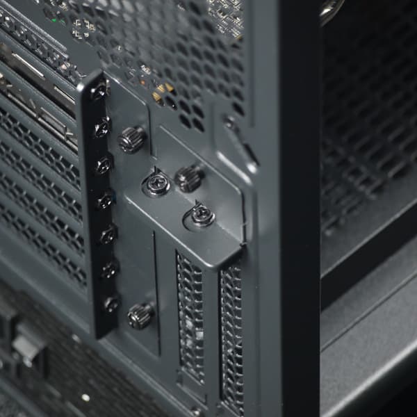 Система фиксации тут самая обычная: крепление на винтах снаружи корпуса с индивидуальной фиксацией винтом и общей прижимной планкой на двух винтах под крестовую отвертку. Все заглушки для плат расширения съемные, фиксируются одним винтом под крестовую отвертку.