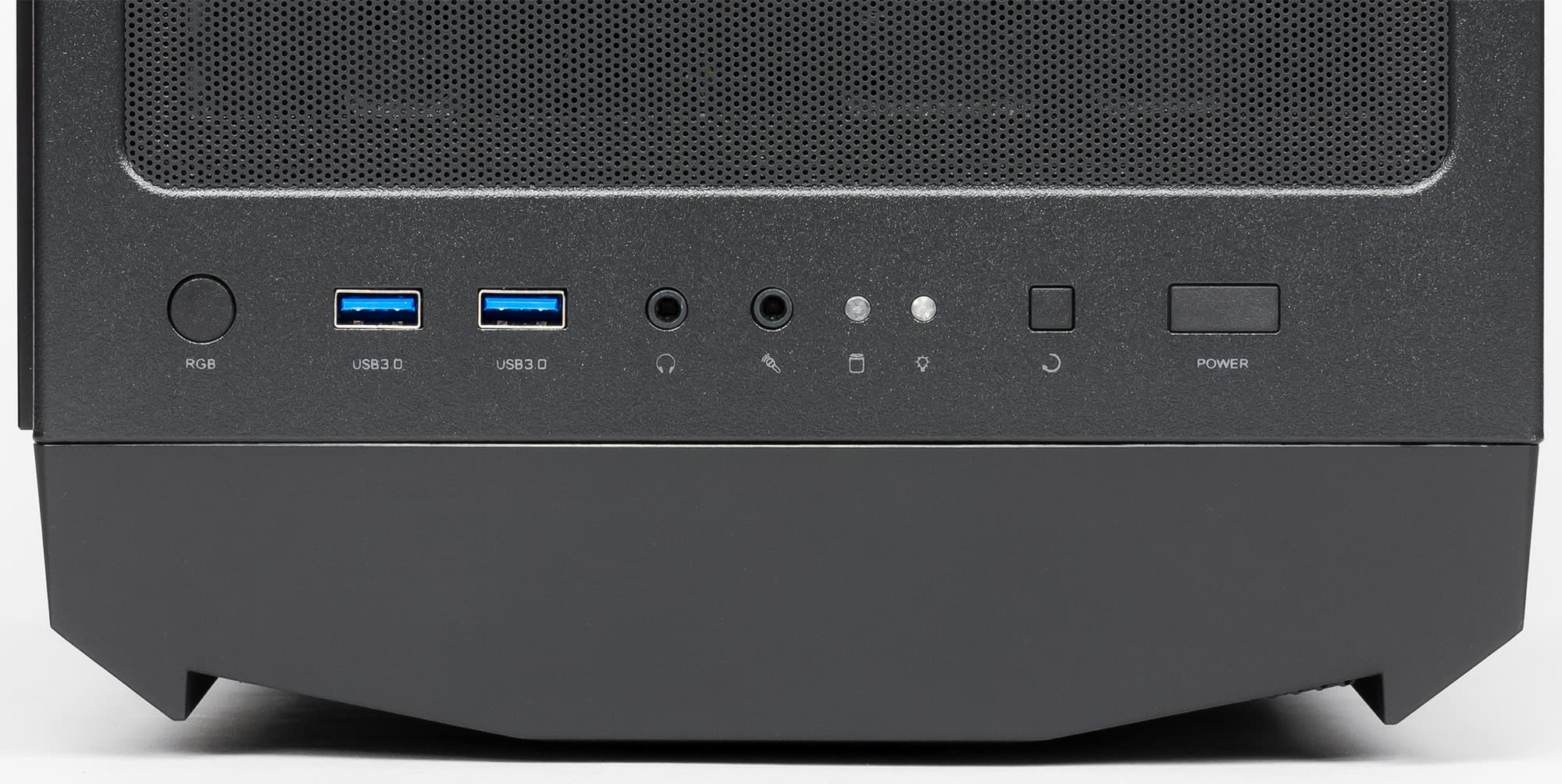 Органы управления и коммутации размещены на верхней панели. В их состав входят: два разнесенных друг от друга примерно на 8 мм порта USB 3.0, стандартные разъемы для подключения микрофона и наушников, кнопка включения, кнопка перезагрузки (Reset), кнопка управления подсветкой.