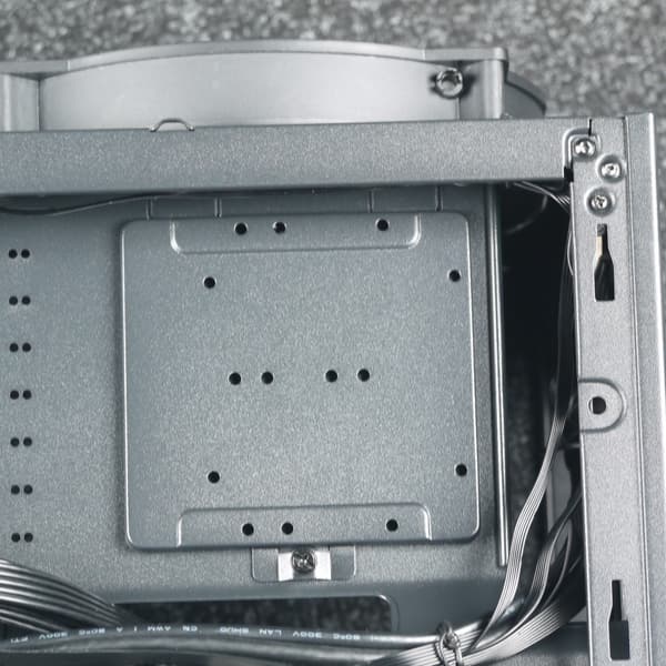 Дополнительно на обратной стороне основания для системной платы предусмотрены два посадочных места для накопителей формата 2,5 дюйма. Крепление каждого накопителя осуществляется на съемную стальную пластину, которая фиксируется одним винтом с накатной головкой. Никакой амортизации не предусмотрено.