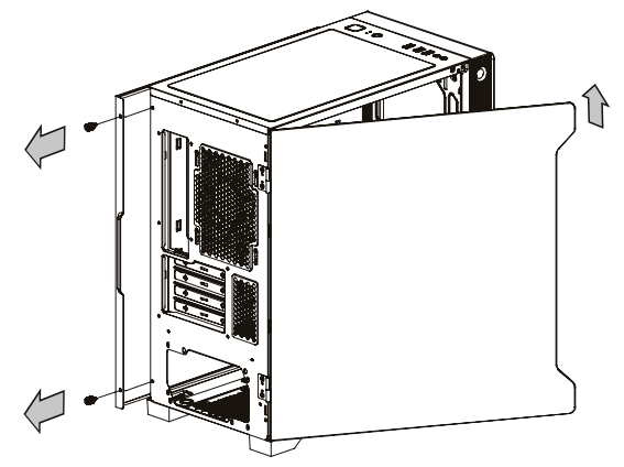 Правая стенка крепится с помощью двух винтов с накатной головкой и распашной системы с зацепом стенки за вертикальный борт шасси спереди. Подобная система крепления в разных вариациях довольно часто встречается в среднебюджетных корпусах. Стальная стенка по удобству манипулирования уступает стеклянной, особенно если корпус стоит вертикально.