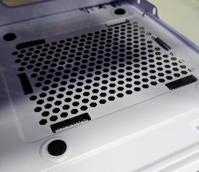 Фильтр для верхней стенки удобнее всего снимается и ставится на место благодаря магнитной окантовке, однако выполнен он из достаточно крупной пластиковой сетки, а потому бо́льшая часть мелких пылинок просочится сквозь него в корпус. С другой стороны, он отлично поможет от падения внутрь корпуса монет, ключей, каких-либо мелких предметов, да и от части пыли тоже спасет.