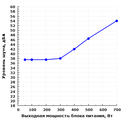 При работе в диапазоне до 300 Вт включительно шум можно охарактеризовать, как находящийся на уровне выше среднетипичного для жилого помещения в дневное время суток, но, тем не менее, шум еще остается в эргономичных пределах. Дальнейшее повышение мощности нагрузки приводит к сильному увеличению уровня шума блока питания: уже при работе на мощности 400 Вт шум довольно высокий, а при работе на мощности 700 Вт шум становится очень высоким не только для жилого, но и для офисного помещения. Таким образом, с точки зрения акустической эргономики данная модель обеспечивает относительный комфорт при выходной мощности в пределах 300 Вт.