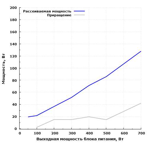 На мощности 700 Вт блок питания рассеивает около 128 Вт, на мощности 50 Вт — около 19 Вт. 60 Вт он рассеивает на мощности около 340 Вт, а 100 Вт — примерно на 560 Вт. Таким образом, экономичность можно считать удовлетворительной.