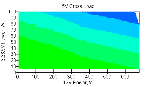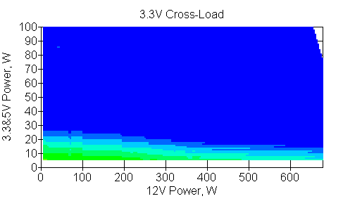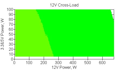 Следующим этапом инструментального тестирования является построение кросснагрузочной характеристики (КНХ) и представление ее на четвертьплоскости, ограниченной максимальной мощностью по шине 3,3&5 В с одной стороны (по оси ординат) и максимальной мощностью по шине 12 В с другой (по оси абсцисс). В каждой точке измеренное значение напряжения обозначается цветовым маркером в зависимости от отклонения от номинального значения.