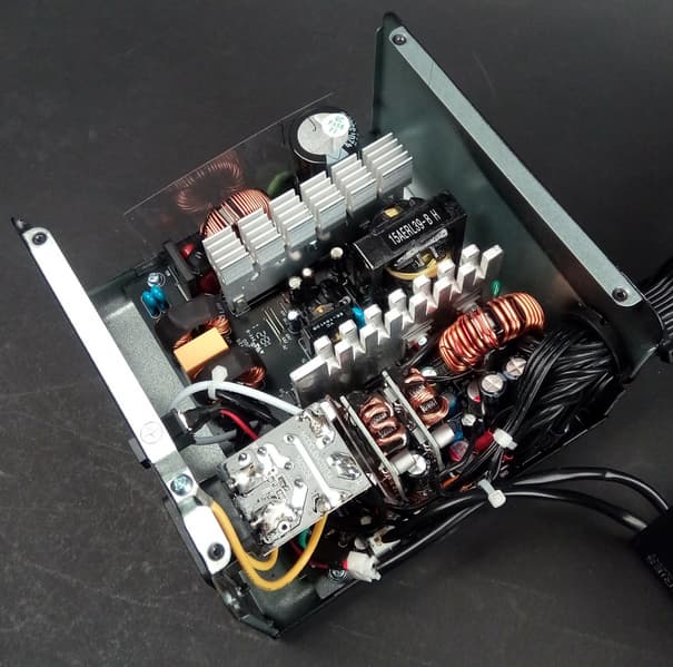 Основные полупроводниковые элементы установлены на двух радиаторах среднего размера с оребрением. Независимые источники +3.3VDC и 5VDC установлены на дочерних печатных платах и, по традиции, дополнительных теплоотводов не имеют — это вполне типично для блоков питания с активным охлаждением.