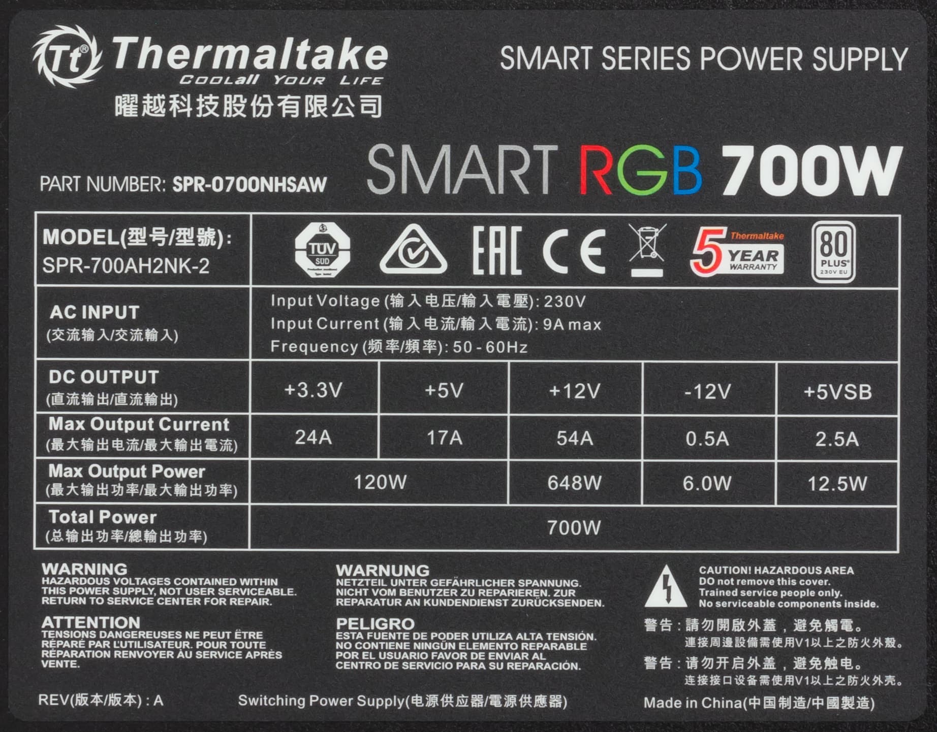 Модель Thermaltake Smart RGB 700W ориентирована на не слишком притязательных пользователей. Из заметных для некоторых потребителей достоинств можно выделить RGB-подсветку, сделав поправку на то, что пользовательское управление тут заключается в переключении заранее заложенных вариантов. Акустическая эргономика у БП, даже по меркам игровых моделей, не впечатляющая, к этому надо быть готовым. Нагрузочная способность канала +12VDC невысокая, без особых проблем блок питания можно использовать лишь при нагрузке до 350 Вт по этому каналу.