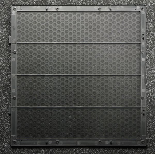 Остальные пять фильтров имеют другую конструкцию. Каждый фильтр выполнен в пластиковой рамке и имеет комбинированное крепление: пластиковая рамка фильтра вставляется одной стороной в паз, который сформирован путем загиба края стальной панели, после чего рамка прислоняется к панели с внутренней стороны и притягивается магнитами.