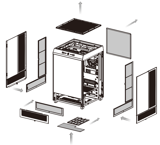 На боковых и передней стенках шасси установлены по две панели: сверху и снизу. Нижняя панель представляет собой штампованную деталь из стали с решеткой посередине, под которой располагается пылевой фильтр.