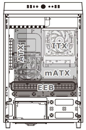 Корпус представляет собой решение башенного типа с вертикально размещаемой платой формата ATX (и менее габаритной) и горизонтальным расположением блока питания снизу. Также заявлена поддержка плат E-ATX, причем плату можно установить полноразмерную длиной до 330 мм (SSI EEB), но только при условии демонтажа верхней части кожуха БП. Без демонтажа поддерживаются укороченные платы E-ATX шириной до 267 мм (SSI CEB).