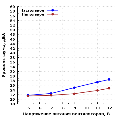 При большем удалении корпуса от пользователя и размещении его, к примеру, на полу под столом шум можно будет охарактеризовать как минимально заметный при питании вентиляторов от 5 В, а при питании от 12 В — как низкий для жилого помещения в дневное время суток.
