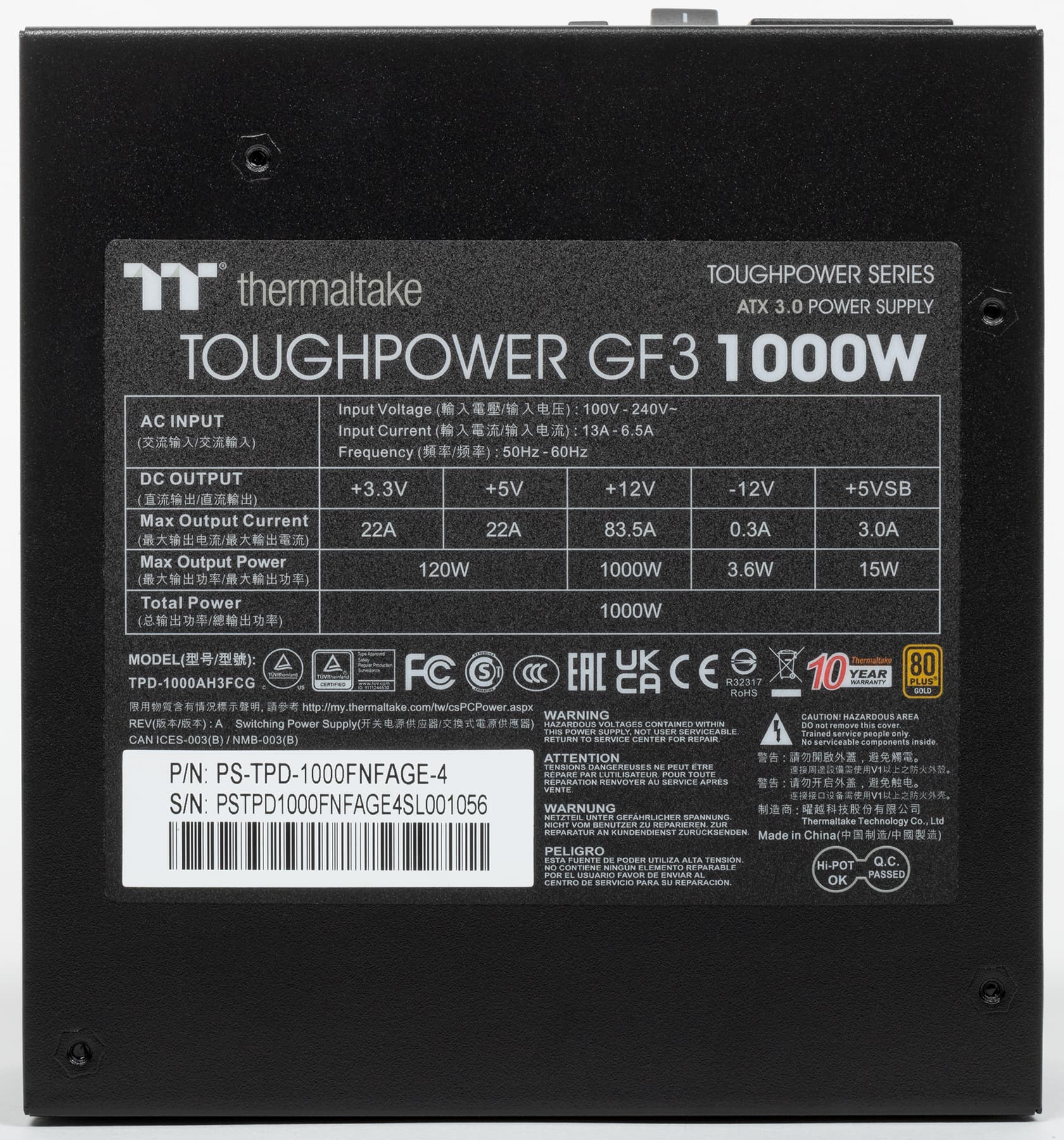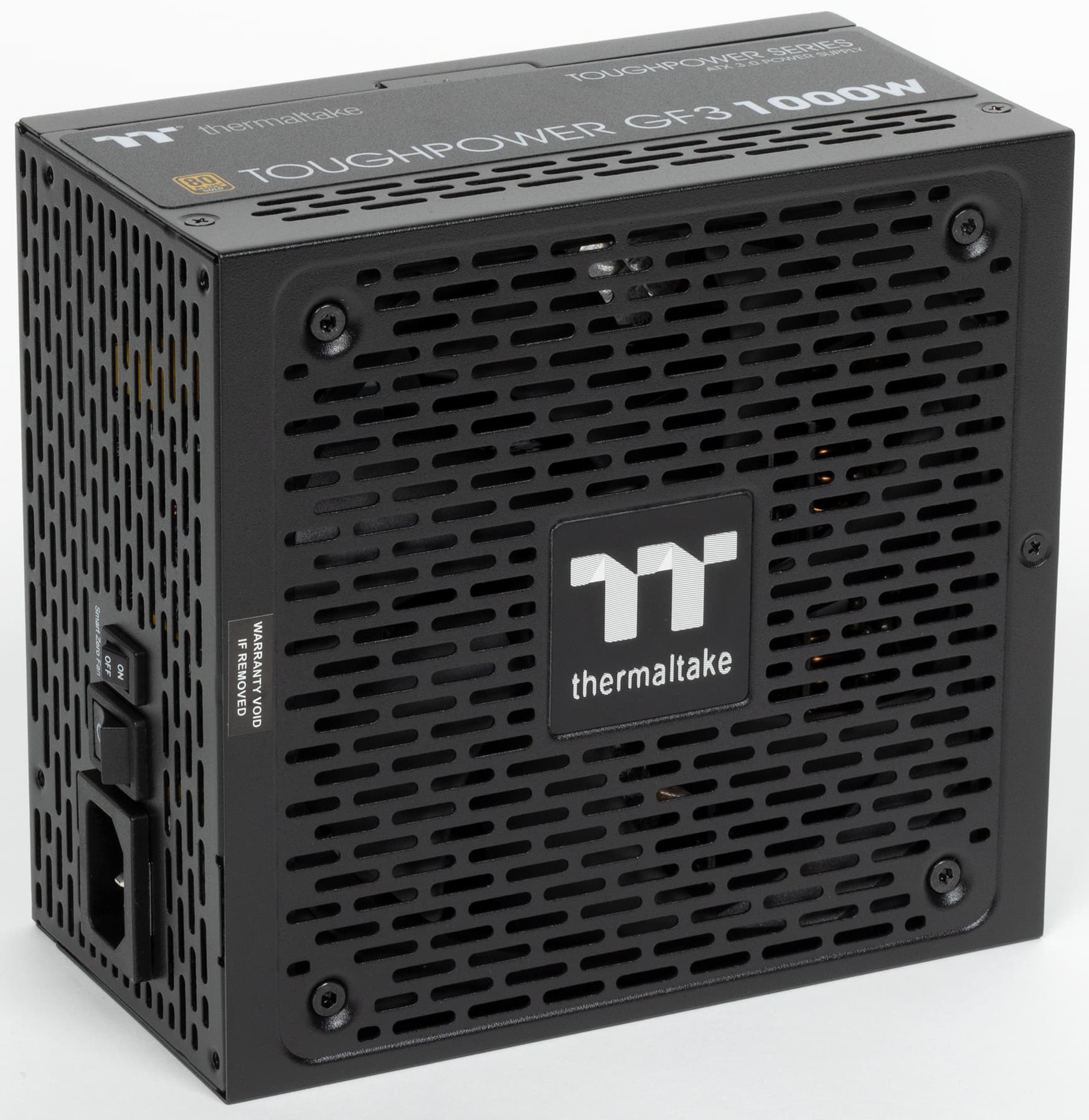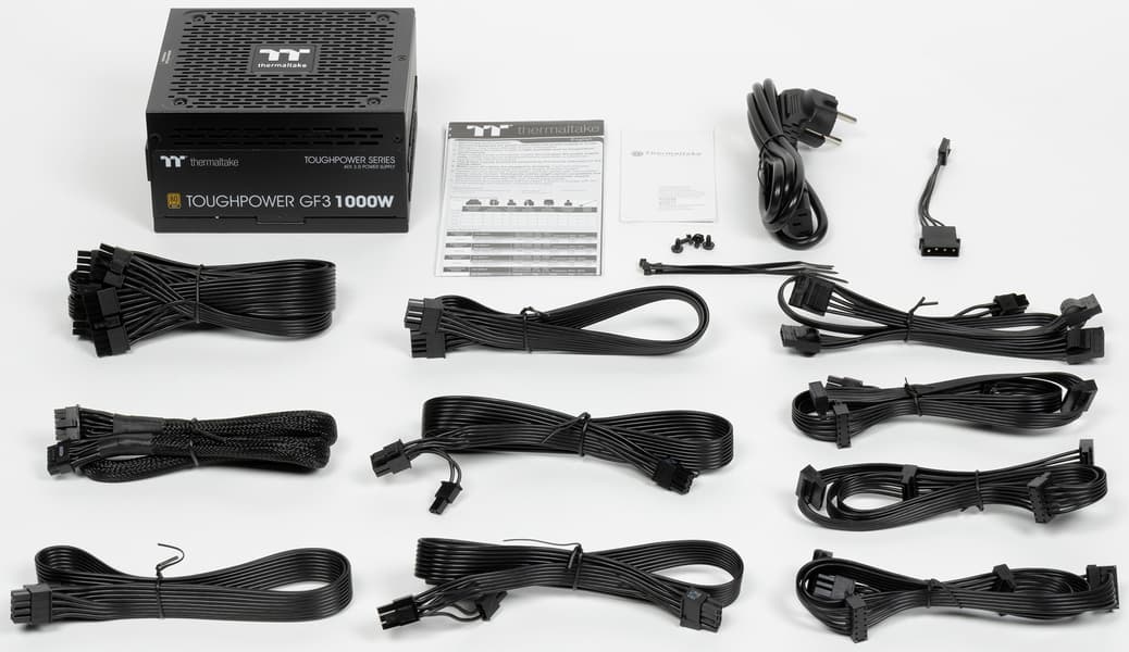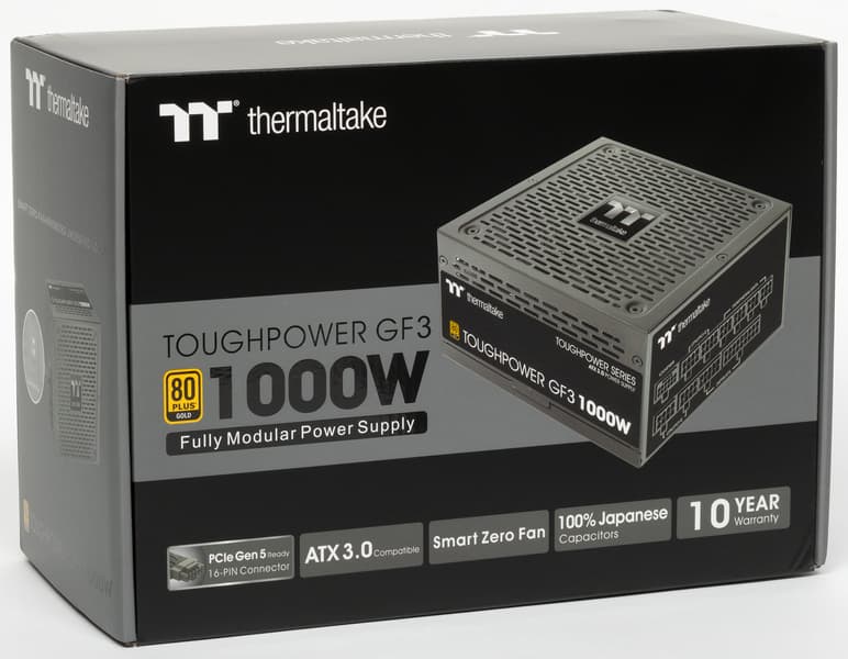 Блок питания Thermaltake Toughpower GF3 1000W, согласно официальным данным, имеет сертификат 80+ Gold и укомплектован исключительно японскими конденсаторами. Система охлаждения может работать в двух режимах: в гибридном, когда вентилятор при некоторых условиях не вращается, и в обычном — с постоянно вращающимся вентилятором. Переключаются режимы двухпозиционной клавишей на внешней панели корпуса БП (позиция On соответствует гибридному режиму).