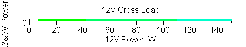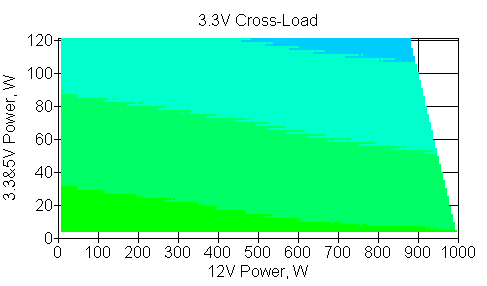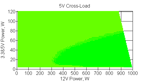 Следующим этапом инструментального тестирования является построение кросснагрузочной характеристики (КНХ) и представление ее на четвертьплоскости, ограниченной максимальной мощностью по шине 3,3&5 В с одной стороны (по оси ординат) и максимальной мощностью по шине 12 В с другой (по оси абсцисс). В каждой точке измеренное значение напряжения обозначается цветовым маркером в зависимости от отклонения от номинального значения.