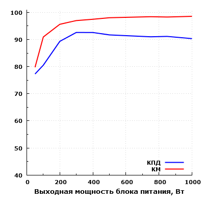 Всего таким образом мы измерили параметры блока питания в 9 точках. В результате максимальный КПД в нашем случае составил 92,6% при выходной мощности 300 Вт. Максимальная рассеиваемая мощность составила 107 Вт при выходной мощности 1000 Вт, что относительно немного для блока питания подобной мощности.