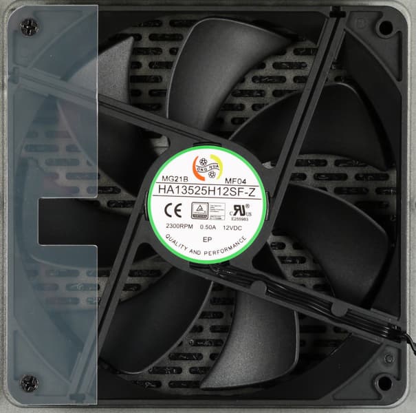 В блоке питания установлен вентилятор HA13525H12SF-Z (2300 об/мин), он основан на гидродинамическом подшипнике и изготовлен компанией Dongguan Honghua Electronic Technology. Подключение вентилятора — трехпроводное, через разъем; управление — при помощи ШИМ.
