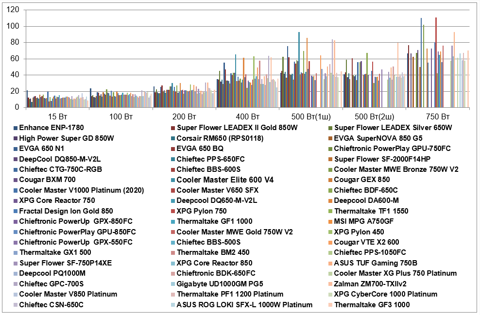 Мы решили выделить несколько типовых вариантов по мощности и соотнести их с количеством разъемов, которое соответствует данным вариантам, то есть максимально приблизить методику измерения экономичности к условиям, которые достигаются в реальном системном блоке. Вместе с тем, это позволит оценивать экономичность разных блоков питания в полностью одинаковых условиях.