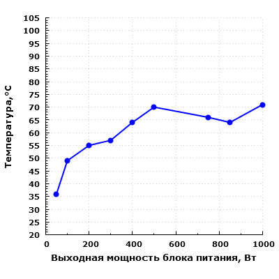 В результате тестирования было установлено, что вентилятор в блоке питания включается только при достижении пороговой мощности 300 Вт. Хотя не исключено, что включение вентилятора имеет и некий порог по температуре, которого нам просто не удалось достичь. А вот отключение вентилятора происходит при выполнении двух условий одновременно: выходная мощность должна быть ниже 300 Вт, а температура — не выше 60 градусов. При этом если вентилятор уже остановился на мощности менее 300 Вт, то повторно он не запустится даже при увеличении температуры, пока потребляемая мощность не превысит 300 Вт.