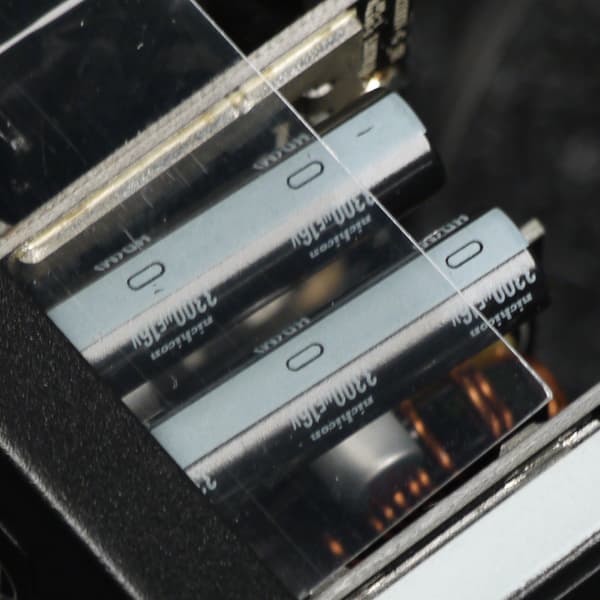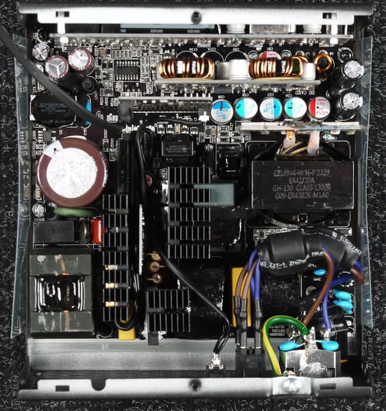 Полупроводниковые элементы высоковольтных цепей размещены на двух радиаторах средних размеров, входной выпрямитель расположен на отдельном теплоотводе. Элементы синхронного выпрямителя размещены на дочерней плате, там же есть небольшие теплорассеивающие элементы в виде тонких пластин. Плата синхронного выпрямителя установлена вертикально, что улучшает охлаждение по сравнению с вариантом размещения элементов синхронного выпрямителя на основной плате методом поверхностного монтажа.