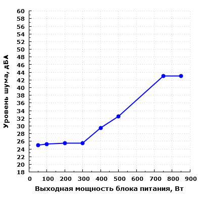 При работе в диапазоне до 300 Вт включительно шум блока питания находится на низком уровне — около 25 дБА с расстояния 0,35 метра. Работающий вентилятор в данных режимах не ухудшит общую акустическую эргономику компьютера даже ночью.