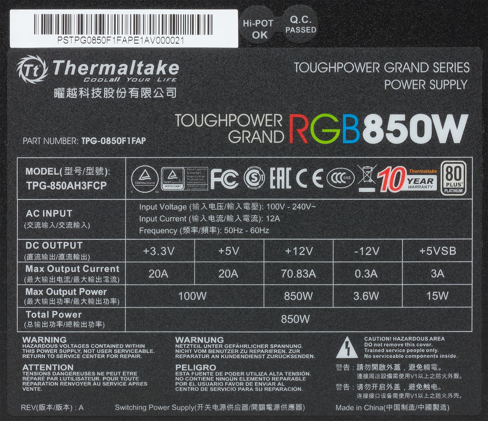 В серии Toughpower Grand RGB Platinum компании Thermaltake представлено три модели БП мощностью 850, 1050 и 1200 Вт. Все три источника питания имеют сертификат 80Plus Platinum, нам предстоит познакомиться с младшим представителем данной немногочисленной группы — блоком питания Thermaltake Toughpower Grand RGB 850W Platinum.