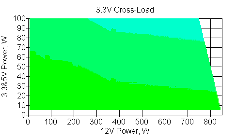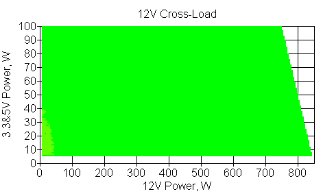 Следующим этапом инструментального тестирования является построение кросснагрузочной характеристики (КНХ) и представление ее на четвертьплоскости, ограниченной максимальной мощностью по шине 3,3&5 В с одной стороны (по оси ординат) и максимальной мощностью по шине 12 В с другой (по оси абсцисс). В каждой точке измеренное значение напряжения обозначается цветовым маркером в зависимости от отклонения от номинального значения.