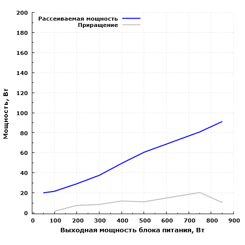 Экономичность модели находится на очень хорошем уровне: на максимальной мощности БП рассеивает около 91 Вт, 60 Вт он рассеивает на мощности порядка 500 Вт. На мощности 50 Вт блок питания рассеивает около 20 Вт.