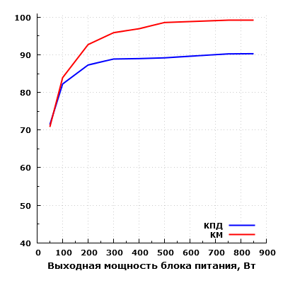 Эффективность БП находится на достойном уровне. Согласно нашим измерениям, КПД данного блока питания достигает значения свыше 88% в диапазоне мощности от 300 до 850 ватт. Максимальное зарегистрированное значение составило 90,3% на мощности 750 Вт. Одновременно с этим, КПД на мощности 50 Вт составил 71,4%.